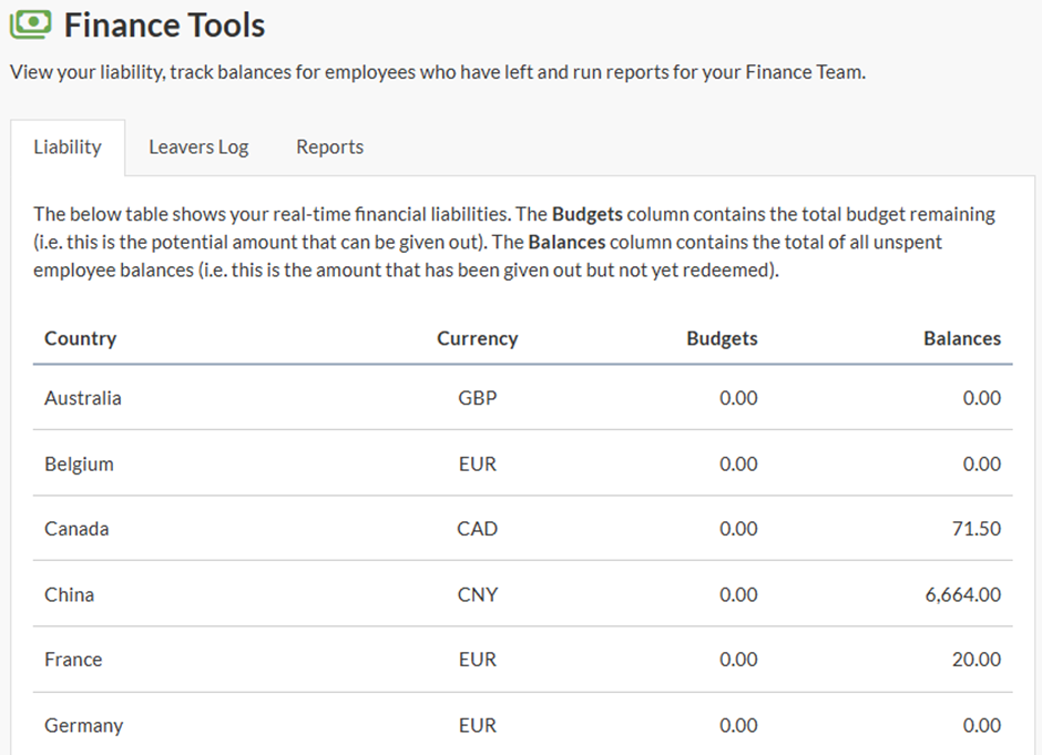 An additional report is available called Issued vs Redeemed. This breaks down financial rewards issued, redeemed and closing balance for each department, so you can further analyse your liability: