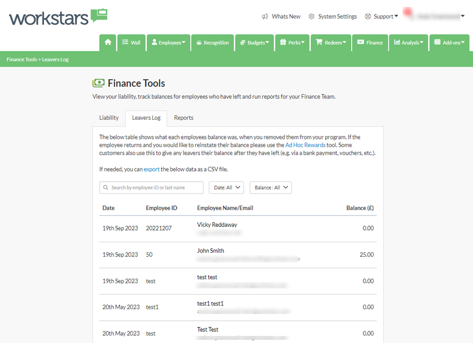 Improvements to the leavers log, notably the ability to export a report of any leavers and their remaining balance: