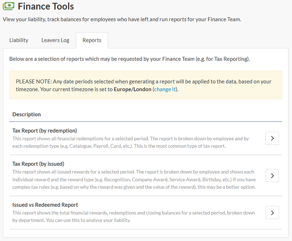 - By redemption – This replaces the old tax report. It tracks the total financial value redeemed by each employee within the given period, with a breakdown of how the value was redeemed e.g. gift cards, client catalogue or payroll. This allows you to split the file if you have already managed the tax liability, for example, it’s already been processed through payroll, or there are different tax liabilities on the type of reward redeemed.